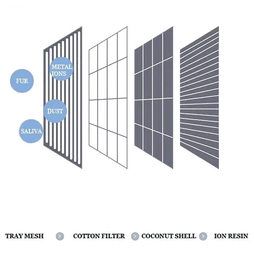 - ترشيح ثلاثي وتنقية شاملة: يمكن لفلتر الكربون النشط ثلاثي الأبعاد أن يحبس بقايا الطعام وشعر القطط بشكل فعال، ويقلل من المواد العضوية والكلور المتبقي، ويمتص الروائح لضمان قدرة حيواناتك الأليفة على شرب مياه نظيفة وصحية.