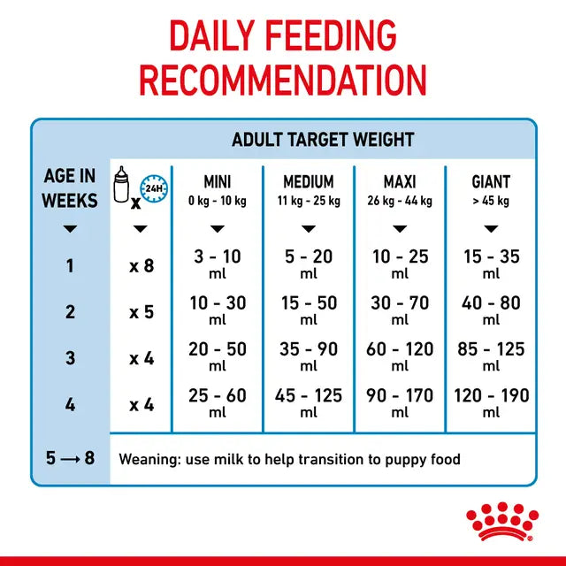 Daily feeding recommendation / AGE IN WEEKS / 24H / ADULT TARGET WEIGHT / MINI – SMALL / MEDIUM / MAXI – LARGE / GIANT / XX kg / XX lb / XX ml / Weaning: use milk to help transition to puppy food /