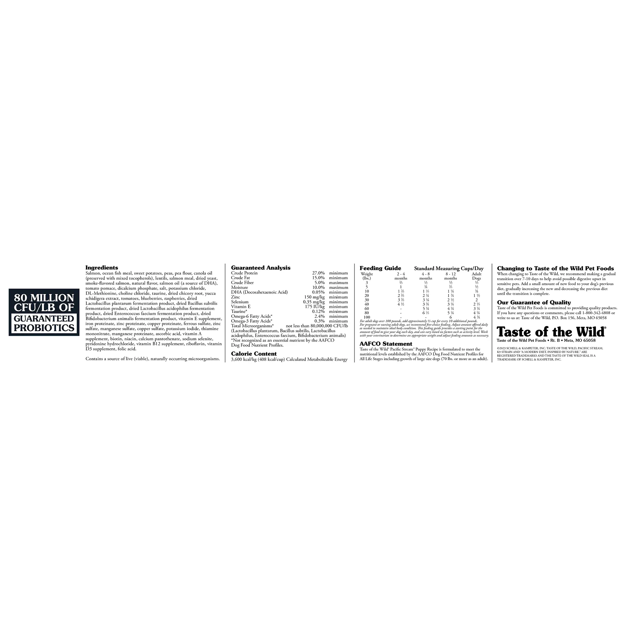 سمك السلمون، دقيق سمك المحيط، البطاطا الحلوة، البازلاء، دقيق البازلاء، زيت الكانولا (المحفوظ مع مزيج من التوكوفيرول)، العدس، دقيق السلمون، الخميرة المجففة، سمك السلمون بنكهة الدخان، النكهة الطبيعية، زيت السلمون (مصدر لـ DHA)، ثفل الطماطم، فوسفات ثنائي الكالسيوم، الملح، كلوريد البوتاسيوم، DL-Methionine، كلوريد الكولين، التورين، جذر الهندباء المجفف، مستخلص اليوكا شيديجيرا، الطماطم، التوت الأزرق، التوت الأحمر، منتج تخمير Lactobacillus plantarum المجفف، منتج تخمير Bacillus subtilis المجفف، منتج تخمير Lactobacillus acidophilus المجفف، منتج تخمير Enterococcus faecium المجفف، منتج تخمير Bifidobacterium animalis المجفف، مكمل فيتامين E، بروتينات الحديد، بروتينات الزنك، بروتينات النحاس، كبريتات الحديدوز، كبريتات الزنك، كبريتات المنغنيز، كبريتات النحاس، يوديد البوتاسيوم، أحادي نترات الثيامين، بروتينات المنغنيز، حمض الأسكوربيك، مكمل فيتامين أ، البيوتين، النياسين، بانتوثينات الكالسيوم، سيلينيت الصوديوم، هيدروكلوريد البيريدوكسين، مكمل فيتامين ب 12، الريبوفلافين، مكمل فيتامين د 3، حمض الفوليك.