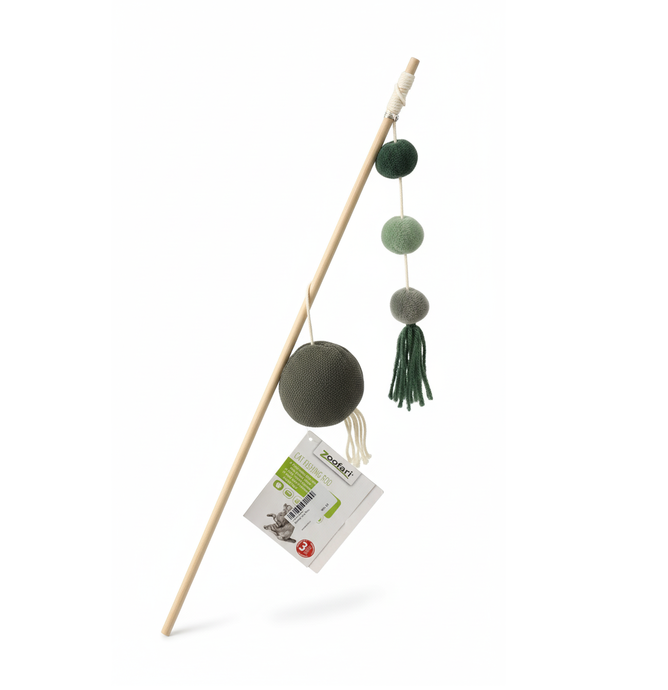 An interactive “fishing rod” toy for cats: a long wand or stick (typically plastic or light metal) with a line/cord attached and a lure-toy at the end (feathers, plush prey, balls, bells). This toy encourages your cat to stalk, pounce and chase — mimicking hunting behaviour in a playful indoor environment.