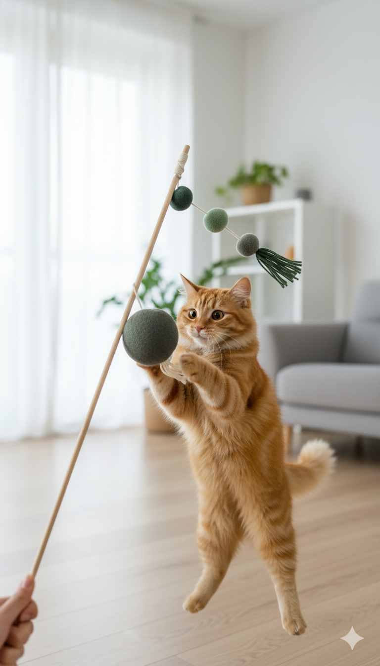 Lure toy at the end: could be feathers, plush mouse/fish, balls or other dangling materials — designed to capture attention.