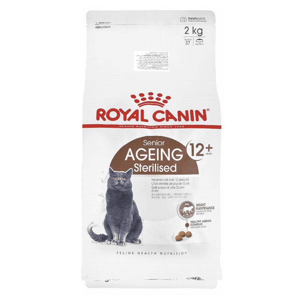 Ageing cats have different nutritional needs than their younger counterparts; that's why it's important to modify your cat's diet as it ages, to ensure that those needs are being met and maintained.ROYAL CANIN® Senior Ageing 12+ is suitable for cats over 12 years of age and is specially formulated with the nutritional needs of senior cats like yours in mind. This food contains highly palatable kibble with a double texture (crunchy outside, soft inside) that helps to stimulate your senior cat's general appetite.ROYAL CANIN® Senior Ageing 12+ contains a patented complex of antioxidants that support senior cats throughout the ageing process. Thanks to a moderate phosphorus level, ROYAL CANIN® Senior Ageing 12+ also helps to support healthy kidney function, which is highly beneficial in senior cats.To cater to each cat's individual preferences, ROYAL CANIN® Senior Ageing 12+ is also available as wet food in either a delicious gravy or succulent jelly. If you're considering mixed feeding, simply follow our feeding guidelines to ensure your cat gets an accurate amount of both wet and dry food for optimal benefit.
