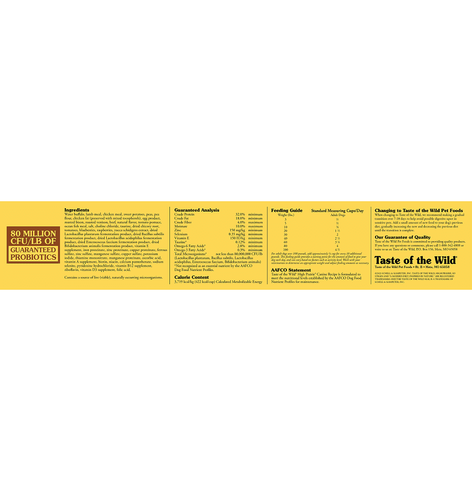 Taste of the Wild High Prairie Canine Recipe is formulated to meet the nutritional levels established by the AAFCO Dog Food Nutrient Profiles for maintenance.